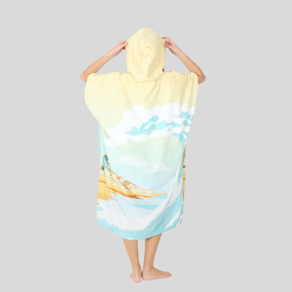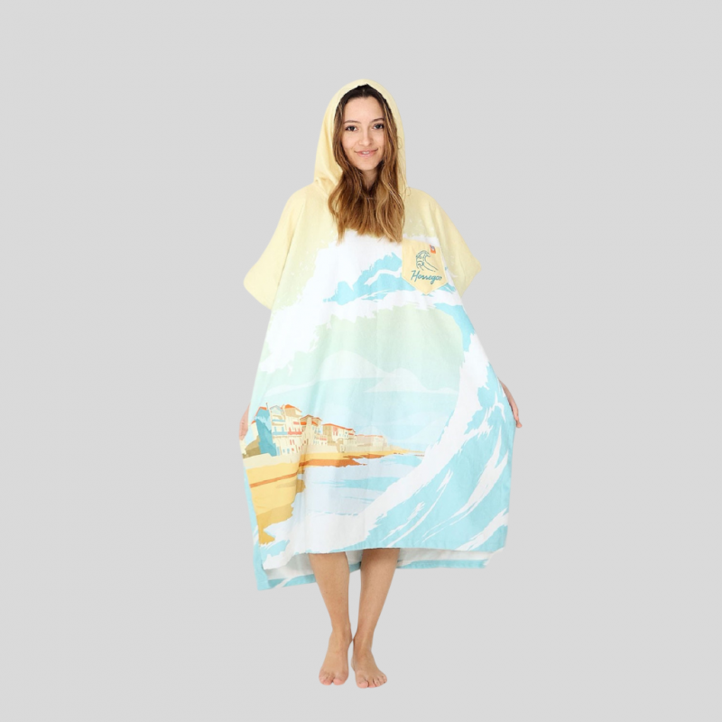 Véritable berceau du surf en France et en Europe, Hossegor inspire ce poncho iconique au design unique, illustrant les bâtiments de la Centrale vus depuis la légendaire vague de La Gravière. Un hommage vibrant à ce spot mythique où puissance et beauté se rencontrent.