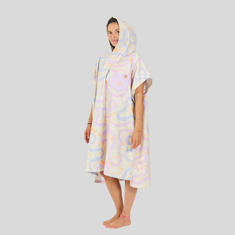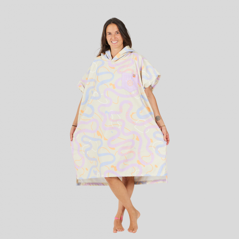 Inspiré de l’univers du cyclisme et des grands espaces, le poncho RoadBike affiche un design unique avec ses motifs de routes sinueuses sur fond sable, évoquant les longues sorties et l’aventure en pleine nature.